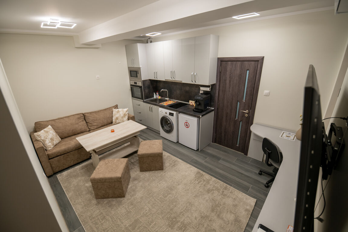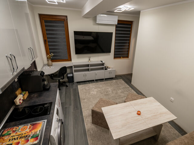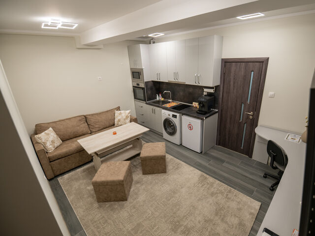 Спалнята е обзаведена с двойно легло и гардероб. Дневната разполага с диван, който се разтяга, маса за хранене и кафе, напълно оборудвана кухня, пералня със сушилня, кафемашина, ютия с дъска за гладене и бюро.