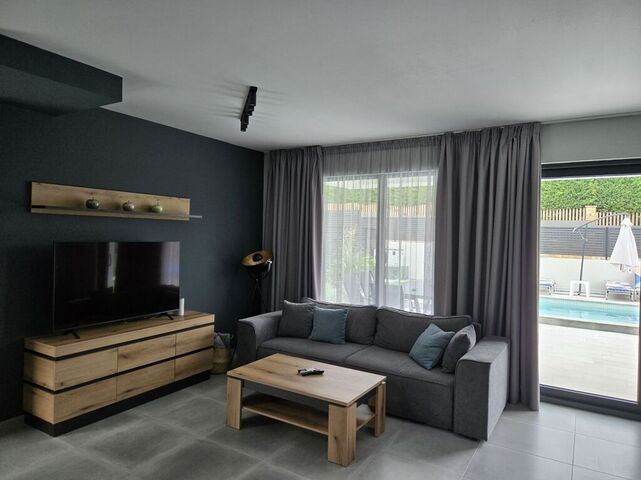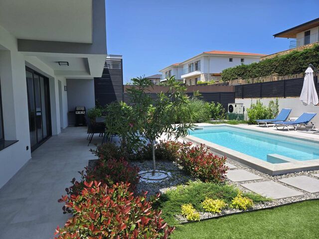 Around the pool you will find sun loungers with comfortable soft cushions, bean bags, umbrellas, as well as a spacious veranda with a large dining table and barbecue. The pool is surrounded by a beautifully landscaped garden, creating a calm and cozy atmosphere for relaxation.