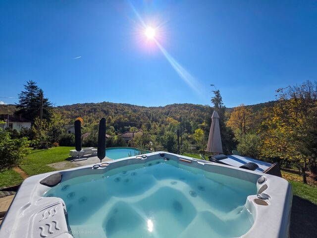 Amenities: outdoor pool, parking, barbeque, fire place, TV set, kitchen, cable television, heating, refrigerator, bathroom / toilet, microwave, coffee machine, terrace, view, radio, iron, hair-dryer, summer garden, tavern, electric kettle. .