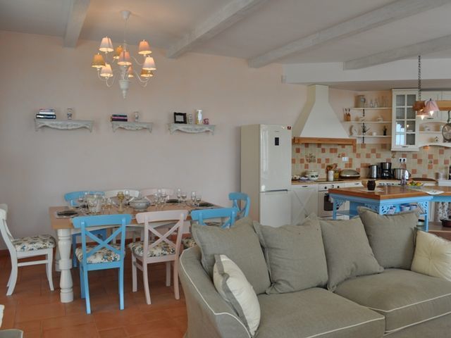 The ground floor living room is spread out on more than 50 sq. m and combines an entrance hall, open plan kitchen, dining and lounge areas. Kitchen is fully fitted with refrigerator with freezer, oven, electric hobs, microwave, dishwasher, extractor, el. kettle, microwave, coffee machine and blends modern features with old-fashioned decor. Lounge area - somewhere to relax with a cup of tea or coffee and a good book - it is definitely your special space to unwind or to keep the children busy with some TV channels. On the same level there is a wet room with washing machine. On the ground floor you will find 2 bedrooms - a twin bedroom with adjacent tiny shower room opposite the corridor and en suite double bedroom - both with direct access to the patio and the swimming pool. Upstairs are the other two bedrooms located - a twin and a double one - both with private shower room. Every detail in Villa Lavandin is thought through to make the home as comfortable as possible.
