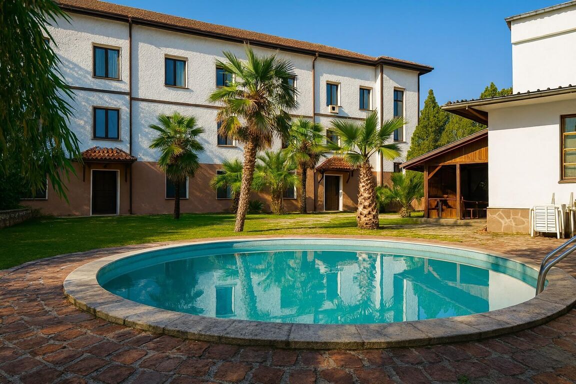 In the large courtyard, surrounded by palm trees, there is a swimming pool with a treatment plant, as well as an indoor outdoor dining area with a colorful barbecue and an oven.