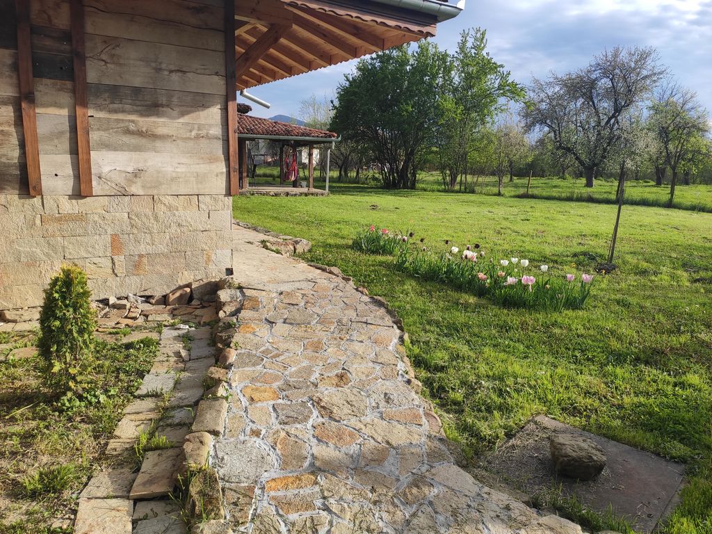 Към къщата има покрита тераса с маса за хранене и градинска чешма.