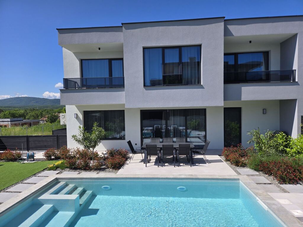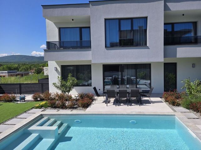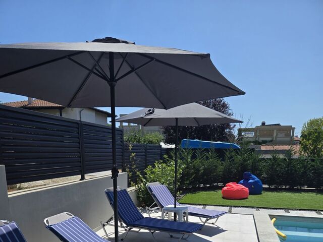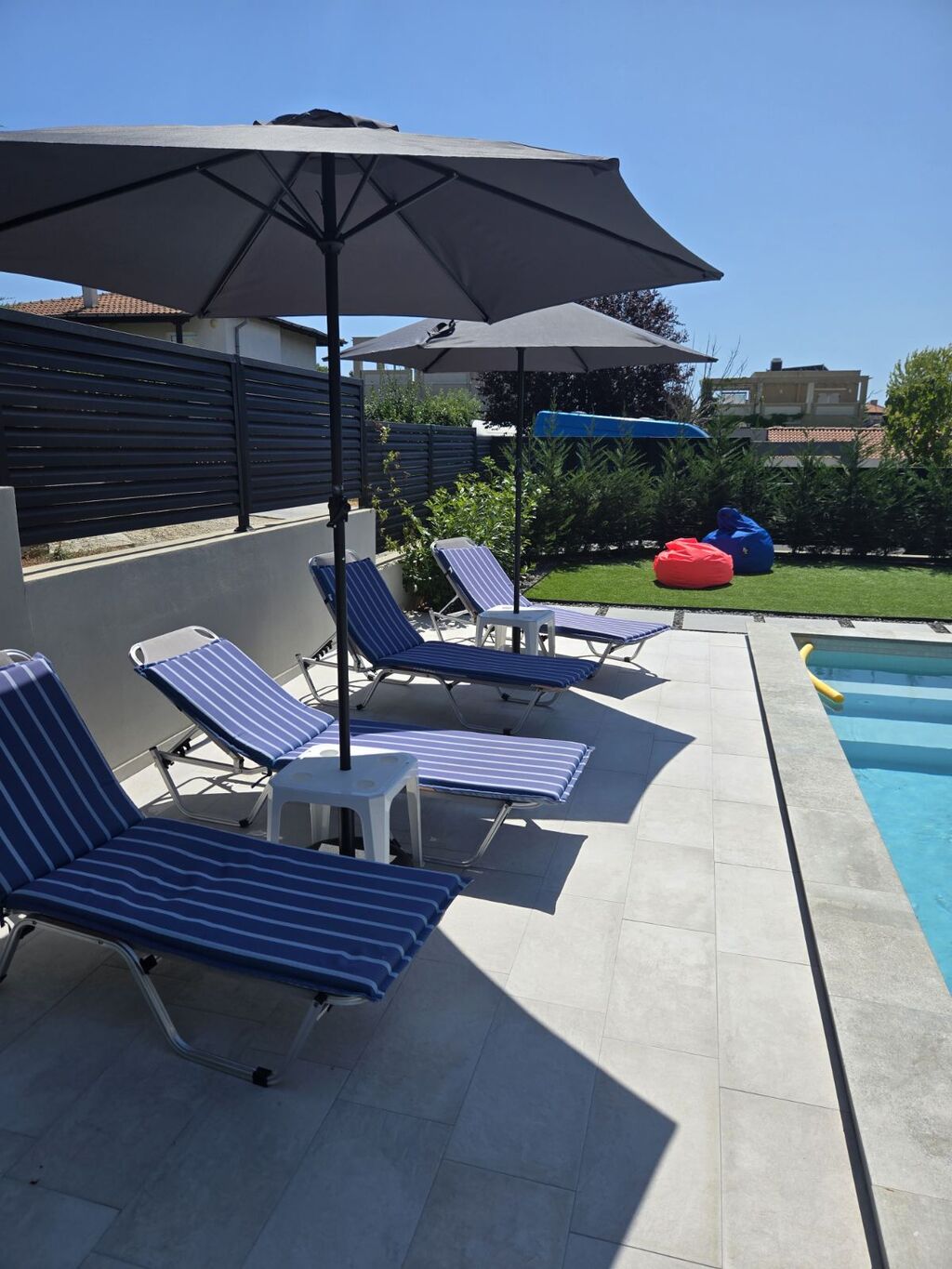 Пространството около басейна е оформено като уютна зона за отдих с удобни шезлонги, меки шалтета, пуфове, чадъри и поддържана градина, както и просторна веранда с маса за хранене и обособен барбекю кът – идеално място за споделени моменти и вечери на открито.