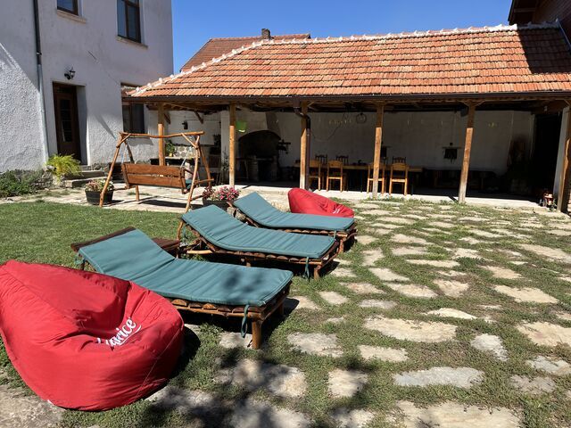 - Навес с маси, пейки и две барбекюта навън- едното е на дървени въглища, а другото е електрическа скара. Имаме и автентична каменна пещ за бавно печене.