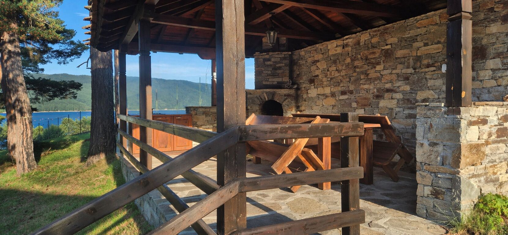 • Панорамен трапезен кът с гледка към язовира