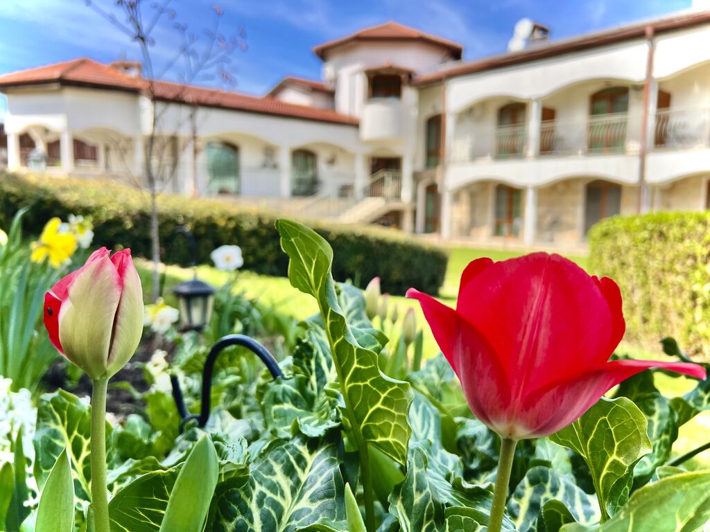 Самия двор е просторен, с красиво озеленяване и обезопасен, за да може децата Ви да играят на воля. В него има детски кът, просторно барбекю и камина, басейн с минерална вода и паркинг за вашите автомобили.