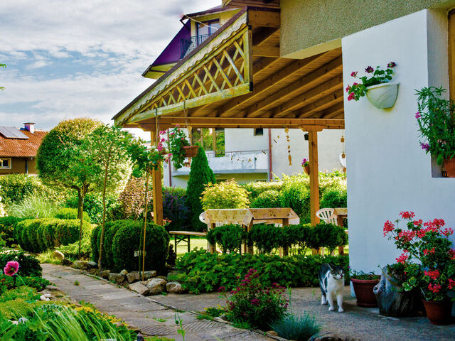 В задния двор на къщата е обособен кът за отдих с градински мебели и барбекю. Къщата разполага и с паркоместа за автомобили.