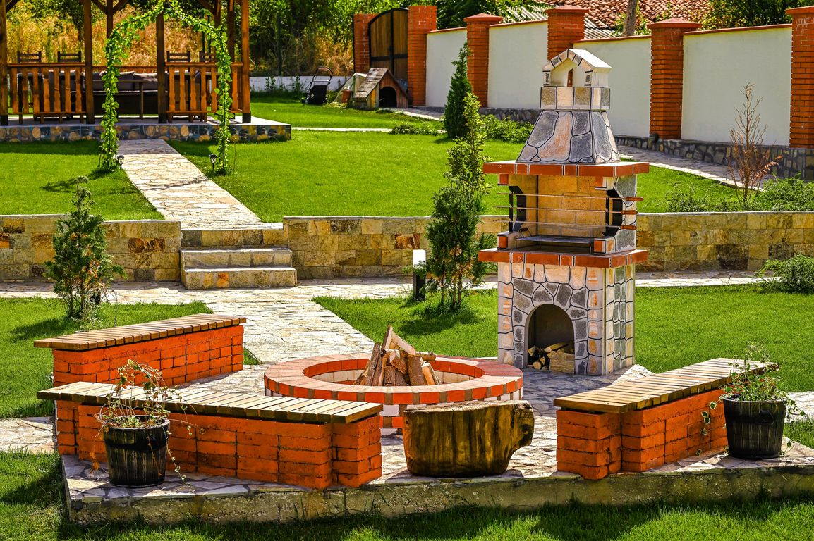 В двора има басейн, джакузи, две шатри, шезлонги, два маси тип буре с щъркели, барбарони, люлка.