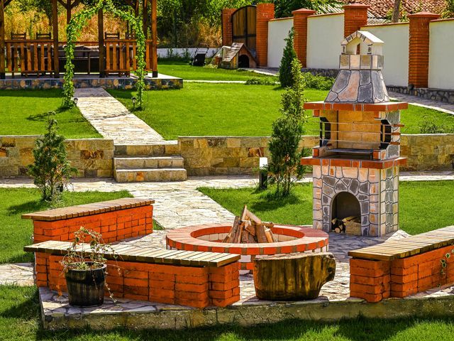 Външно, градено барбекю с всички пособия, огнище тип седенка.