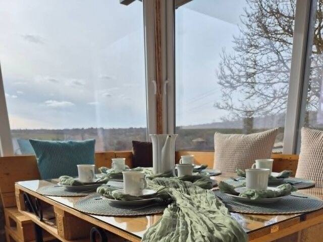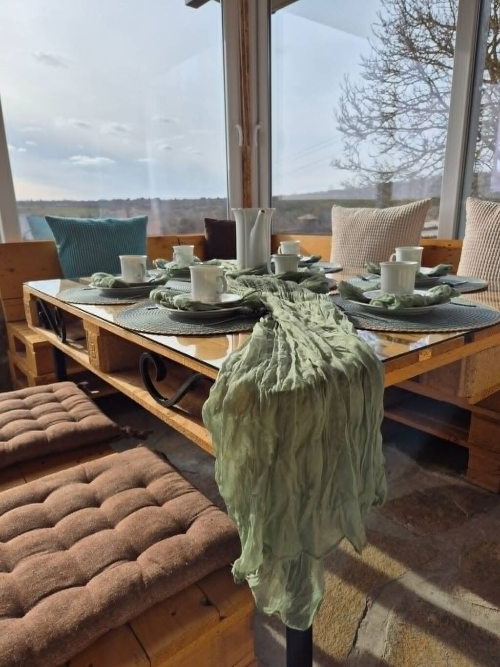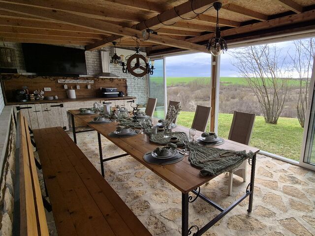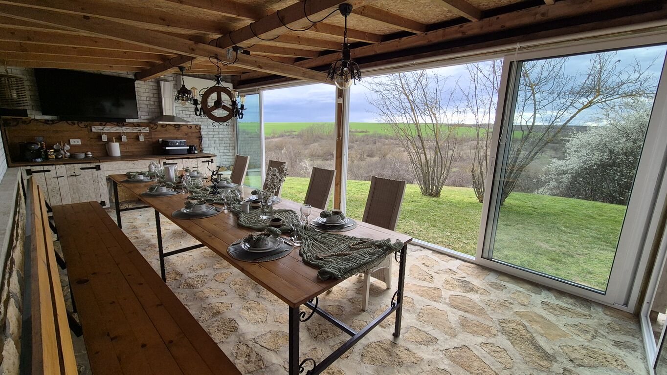 Сърцето на вилата е панорамната зала-беседка с плъзгаща система, проектирана да обединява уюта с природата и всички модерни удобства – 4-метрова маса, голям телевизор със саундбар и кафе-кът (с капсули).