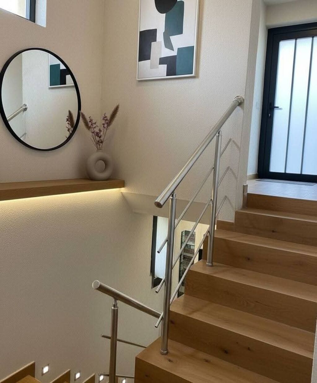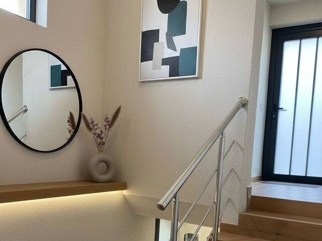 На първия етаж на къщата се намира трапезария с кухня, голяма маса за хранене, телевизор и камина.