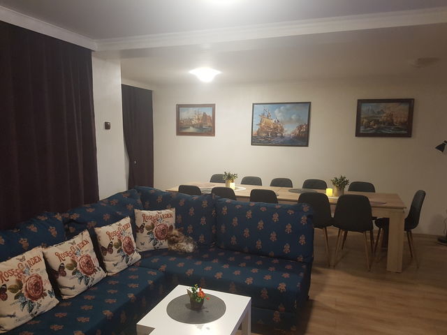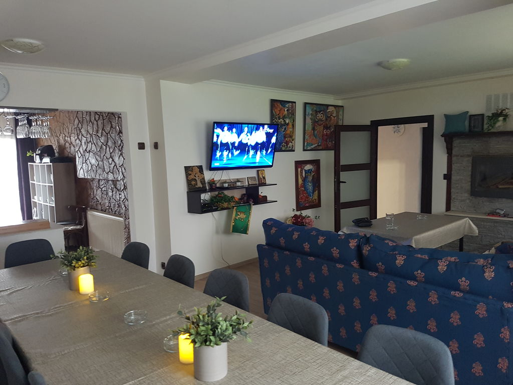 Голям хол с трапезария и кухня (напълно оборудвана), камина.