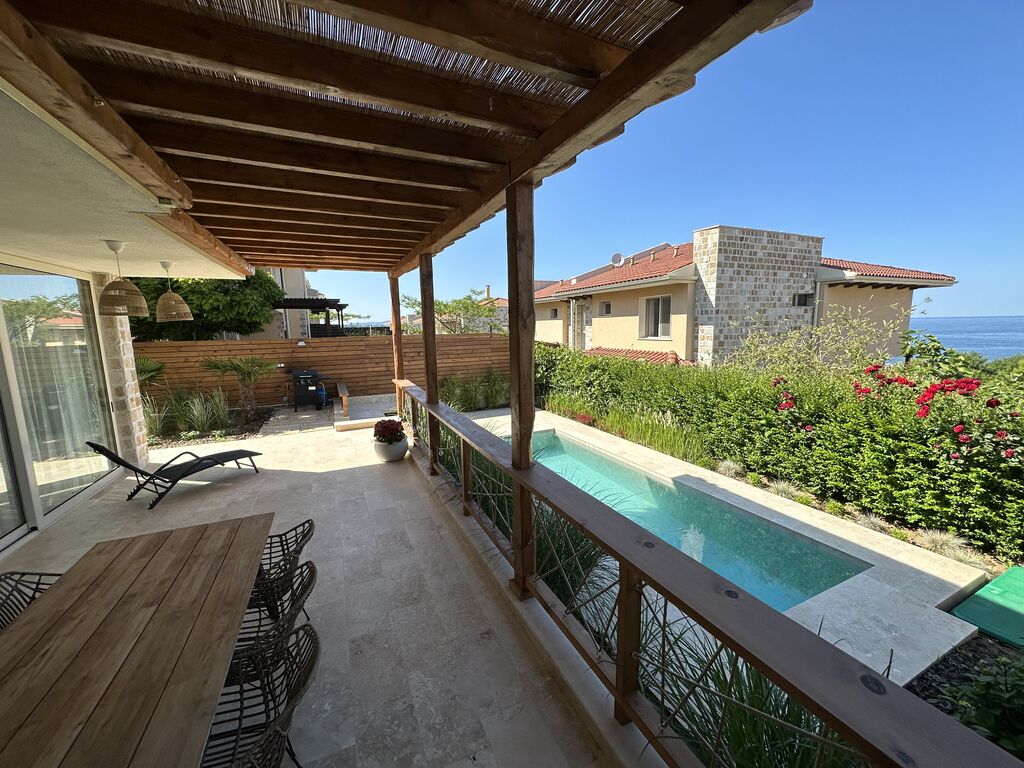Кокетната зелена градина обгражда частния басейн с шезлонг, голямата веранда и външната трапезария, където спокойно може да вечеряте, да се насладите на погалването на прохладния бриз и зашеметяващата гледка към морето.
