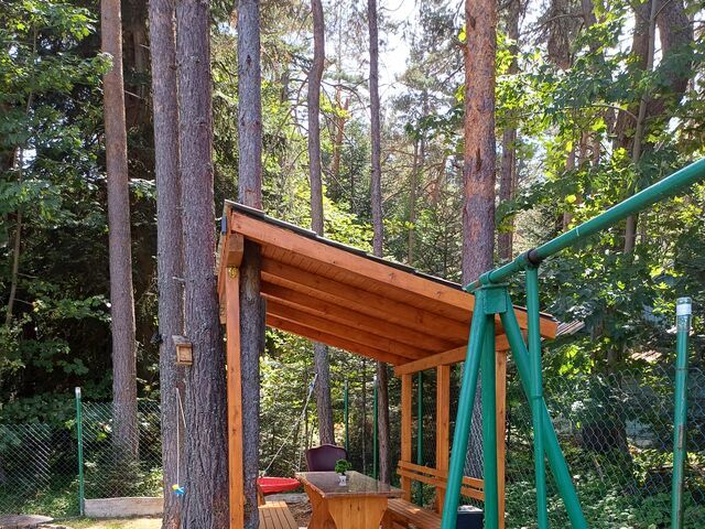 Разполага с 3 спални, 2 хола с разтегателни дивани, 2 бани, веранда, тераса, беседка и детски кът.