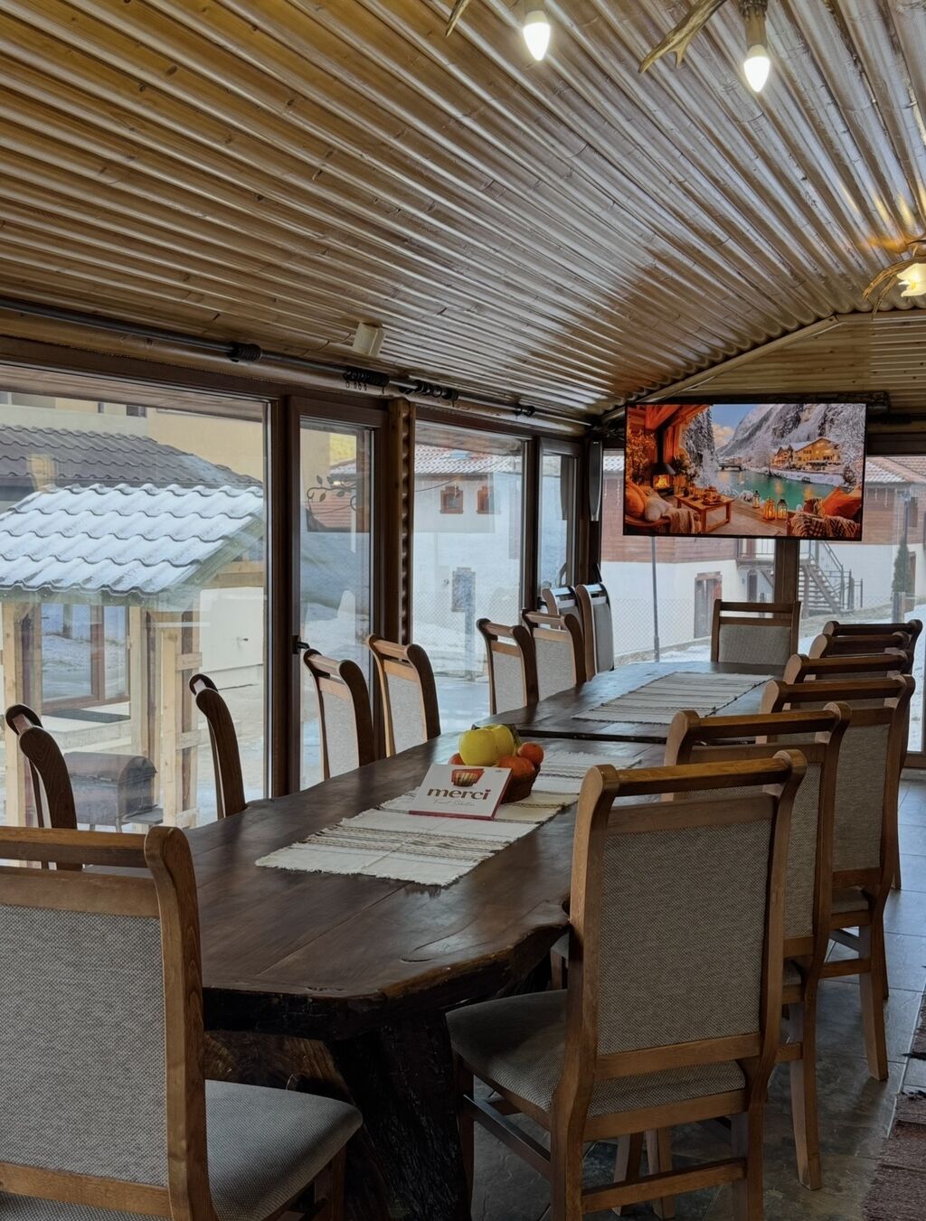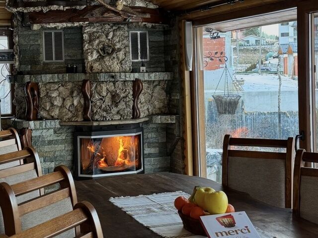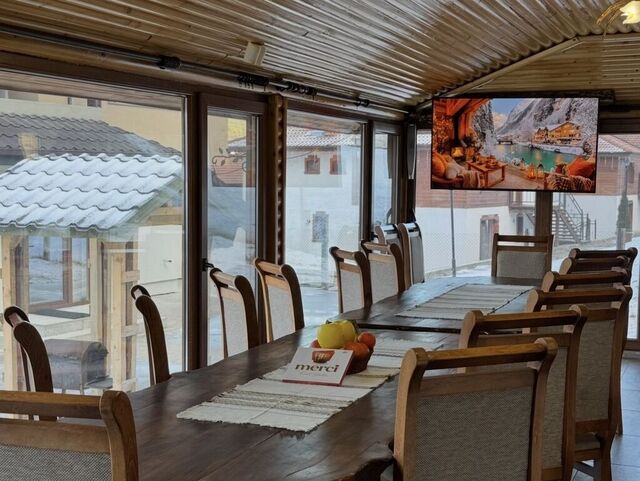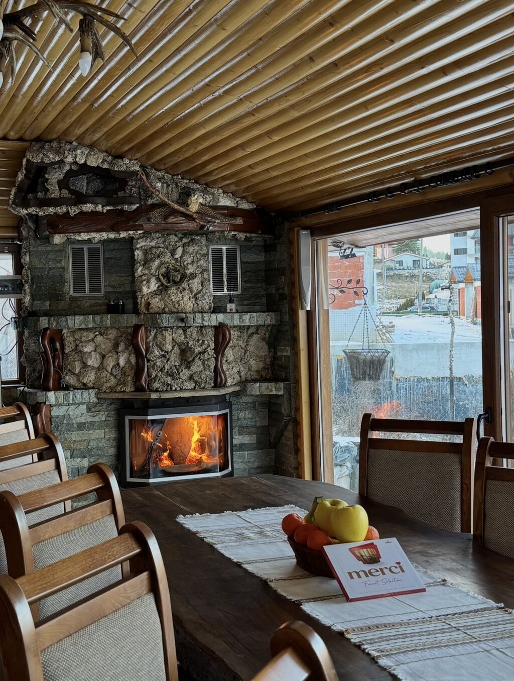 - Просторен хол с камина и голяма маса за 10 човека – идеален за общи вечери