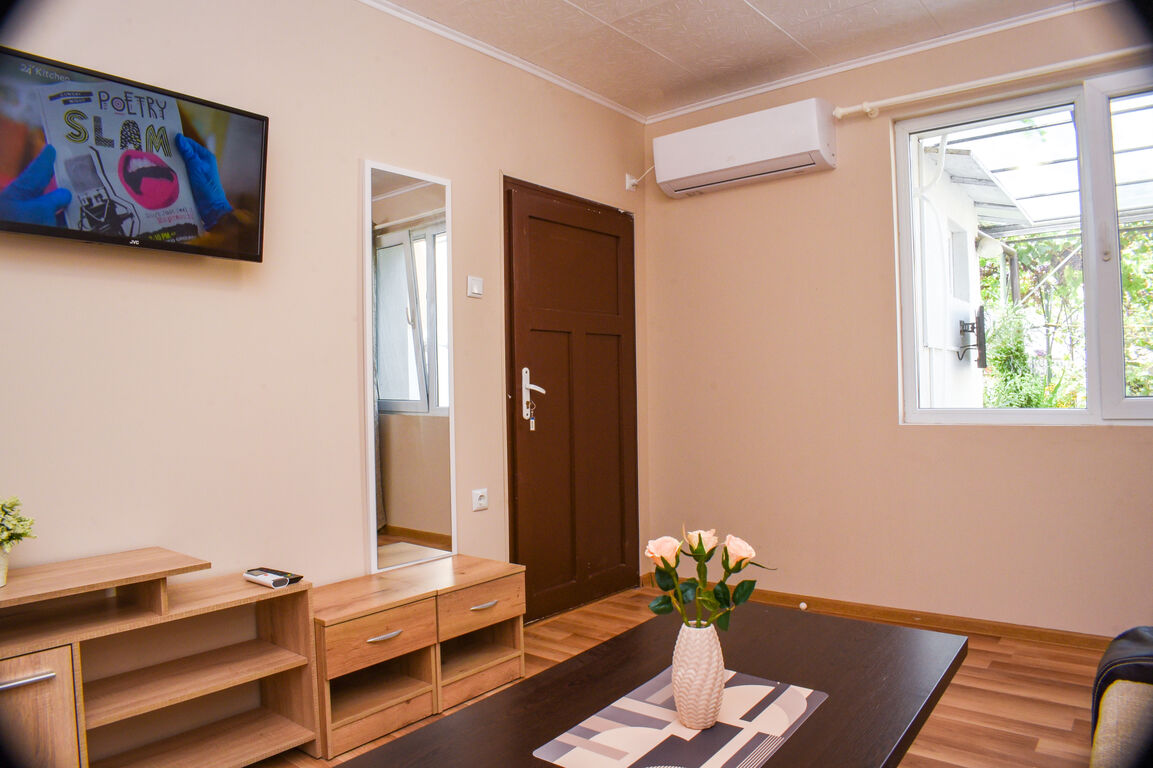 Студиото се състои от спалня (с две единични легла и възможност за сливане) и всекидневна с разтегателен диван, като и двете стаи са оборудвани с климатици, хладилник, телевизори, места за съхранение, спално бельо и др. Лятната кухня е изцяло оборудвана с всичко необходимо - посуда, електроуреди (кафемашина, фурна, котлони, кана, тостер, скара и т.н.), а пъстрият кът за отдих е за компания за дълги вечери на прохлада.