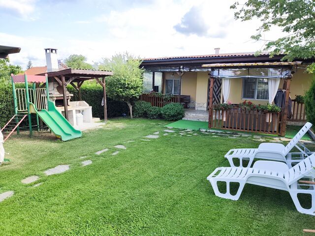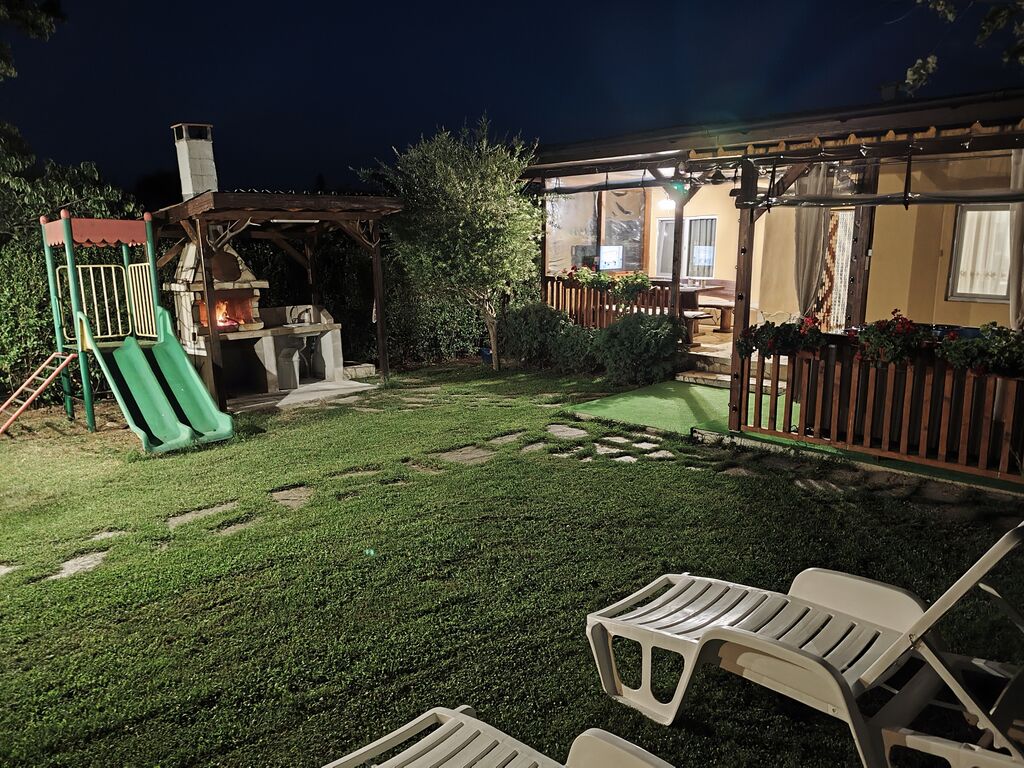 Разполага голям двор, голямо 6-местно градинско джакузи, детска двойна пързалка, батут за игра на малчуганите, дървена люлка и хамак за отдих и релакс, барбекю-камина, полузакрита веранда, голяма открита веранда, обзаведена и оборудвана кухня с помещение за празненства.