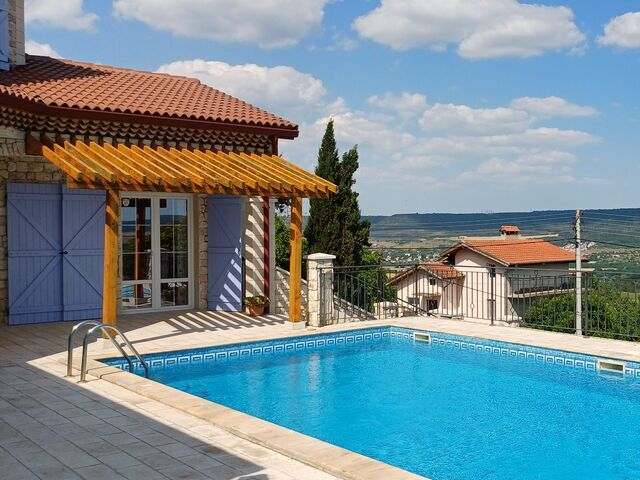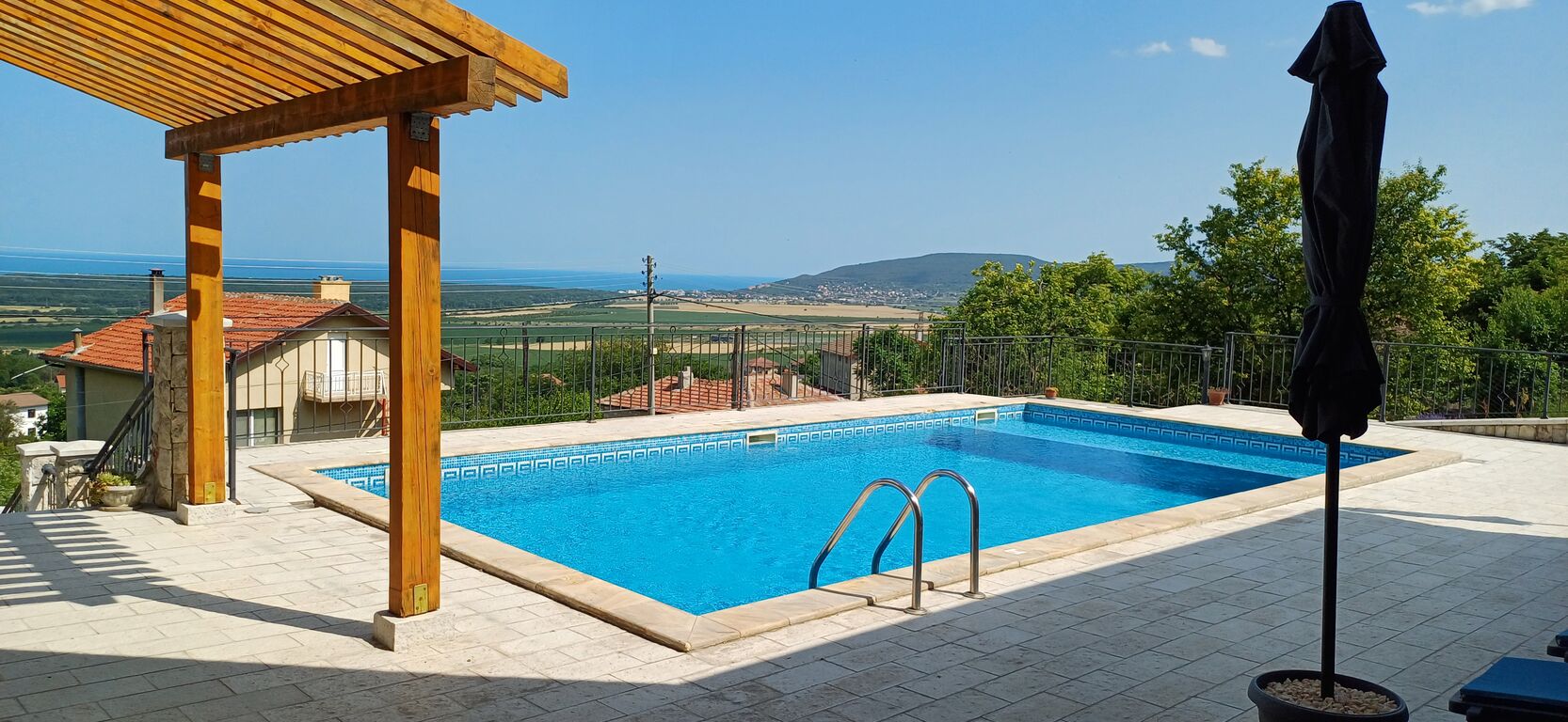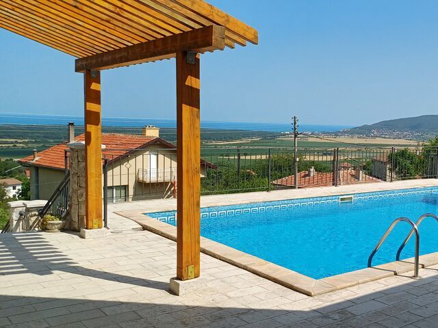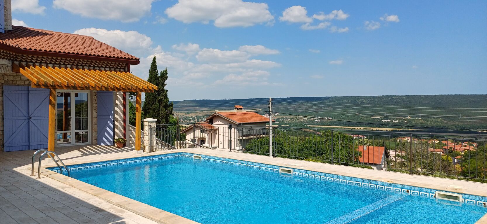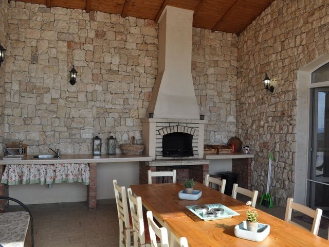 Вляво от къщата се разполага външна зона с каменно барбекю и градински мебели - разкошно място за вашата стилна вечеря на открито. Да релаксираш на верандата край басейна е една от най-големите радости в живота, особено ако в удоволствието е включена и добра книга. Там ще намерите достатъчно прохлада от жаркото обедно слънце, както и завет при ветровито време.