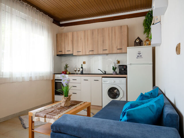Всекидневната включва комфортен разтегателен диван и кухненски бокс, напълно оборудван за приготвяне на храна и напитки.